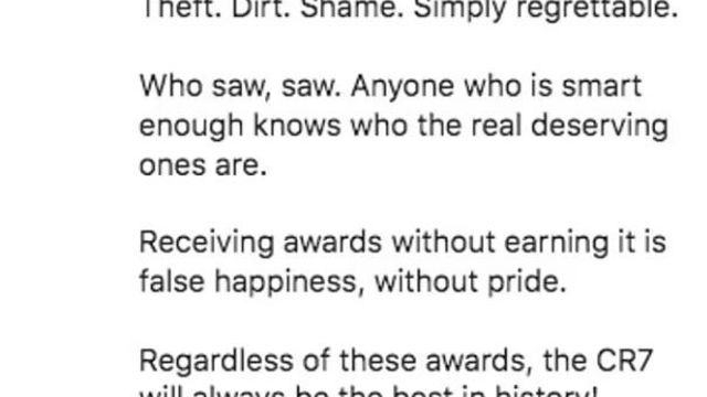 La didascalia, sotto le foto di Ronaldo in campo con Juventus, United e Nazionale, inizia così: "43 gol in un anno, 6 gol in 5 partite di questa Champions League, tutti decisivi e un ragazzo che, a prescindere dall'età, continua a fare miracoli e non smette di stupire il mondo intero. Lo mettono comunque al sesto posto... Credi davvero che 5 ragazzi abbiano fatto più di lui nell'anno? Mai. Avrebbe dovuto competere con Lewandowski che nei numeri individuali è stato incredibile, con il Bayern che ha avuto una stagione migliore della Juventus e ha avuto una stagione meno travagliata rispetto allo United, ma a livello di Nazionale, ad esempio, Cristiano è stato molto meglio. E a chi va il premio? A Messi, che ha vinto solo la Coppa del Re col Barcellona, non ha segnato un gol contro il Real Madrid da quando Cristiano è partito, è scomparso nelle grandi partite della stagione, ha vinto la Copa America che doveva essere ogni 4 anni ma praticamente si gioca ogni anno. Non ha segnato né in finale né in semifinale. E ha individualmente ha avuto una stagione sottotono con il PSG. Cristiano per vincere questo premio deve essere al 300% indiscutibile. Inutile realizzare la rovesciata più bella dell'anno, essere campione di tutto col club, capocannoniere di tutto e segnare una tripletta in Coppa del Mondo, forniscono comunque un modo per prendere il suo premio. Con Messi, è il contrario. Può fare una stagione di basso profilo, molto al di sotto, troveranno sempre un modo per favorirlo e dargli il premio".