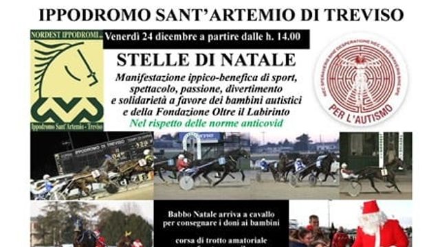 L'ippodromo di trotto di Treviso manda in scena per la vigilia di Natale un convegno speciale, ricco di contenuti e sensibilità, iniziativa capace di "bucare" il muro che sempre più separa l'ippica dal resto del mondo, cittadini, media, istituzioni e potenziale "clientela" (proprietari, appassionati, sponsor, pubblico, scommettitori). Oltre alle corse di routine e allo spettacolo meraviglioso dei cavalli, spesso dimenticati dagli stessi operatori e invece unica vera "arma di seduzione di massa" con le loro storie, non mancherà la musica (con il recital concerto della cantante Manu Ley, del giovane "cantattore" Filippo Rovati, proveniente da Area Sanremo e del cantautore italiano più "a cavallo" di tutti, Alberto "Caramella" Foà) e tre iniziative dedicate ai bambini, con tanto di sensibilizzazione e beneficenza per quelli autistici, tramite la Fondazione Oltre il Labirinto.