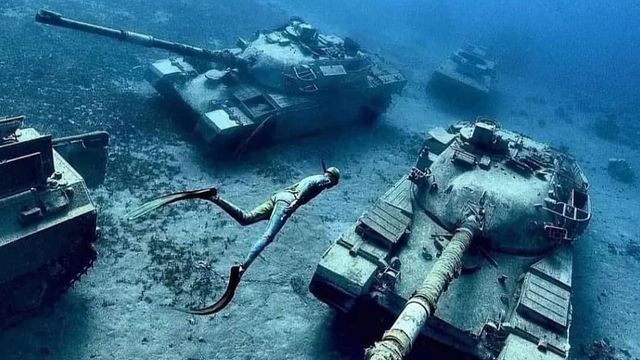 I fondali oceanici di tutto il mondo nascondono i tesori più disparati. Il gigantesco relitto del Titanic che dal 1912 si trova a 3810 metri di profondità nelle acque dell’Oceano Atlantico è solo un esempio. In Giordania, sul fondale del Mar Rosso a circa 15-28 metri di profondità, si trova l’Underwater Military Museum Dive Site, il primo museo militare sottomarino del mondo composto da 19 mezzi militari pesanti forniti dalle Forze Armate Giordane, tra cui carri armati, elicotteri e portaerei schierati in formazione da battaglia. La location del museo non è causale: per collocare i mezzi è stata scelta appositamente una zona particolarmente povera di coralli e biodiversità, nella speranza che il materiale affondato possa costituire un vero e proprio nuovo reef artificiale per le specie marine.