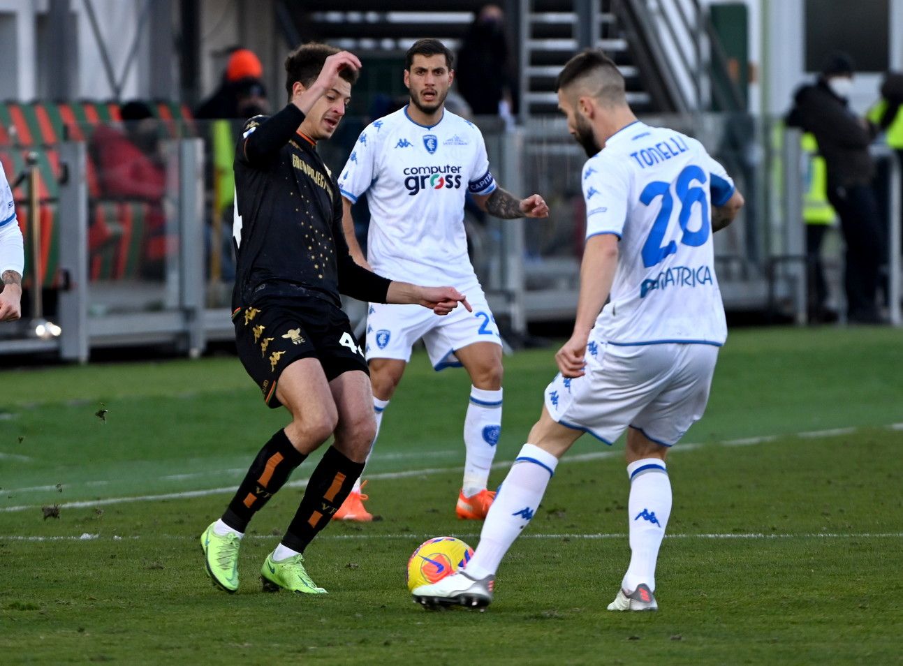 Alle prese con nuovi contagi Covid e qualche cambio tattico obbligato, contro l'Empoli Zanetti piazza Aramu e Kiyine nel tridente accanto a Henry. Senza Di Francesco, Andreazzoli invece puntella la mediana e si affida a Henderson e Bajrami alle spalle di Pinamonti. Alto e aggressivo, è l'Empoli a partire meglio attaccando la profondità sugli esterni. Il primo squillo del match arriva su calcio d'angolo, ma Lezzerini è attento. Poi tocca a Henderson testare i riflessi della retroguardia neroverde. Compatta e ordinata, la squadra di Andreazzoli copre bene gli spazi e riparte manovrando in verticale con rapidità e precisione. Poco aggressivo sulle seconde palle, il Venezia invece fatica a trovare la quadra a centrocampo e soffre gli strappi dei toscani. Lezzerini si supera su una grande girata di testa di Pinamonti sugli sviluppi di un corner, poi un bolide al volo di Bandinelli sfiora la traversa e un sinistro a giro di Zurkowski esce di poco. Pescato da un'imbucata di Cuisance, Aramu prova a interrompere il forcing dell'Empoli con un diagonale pericoloso, ma Vicario è attento e la squadra di Andreazzoli continua a macinare gioco e a spingere. Bajrami conclude male una grande azione, poi Zurkowski sblocca la gara facendosi trovare al posto giusto su un bel cross di Bandinelli. Gol che rompe l'equilibrio e concretizza il dominio degli uomini di Andreazzoli. Ispirato e sempre pronto a inserirsi, Zurkowski prova a raddoppiare subito di testa, ma Lezzerini non si fa sorprendere. Poi Henry innesca Crnigoj, ma lo sloveno non centra la porta. In svantaggio e in difficoltà nella manovra, poco dopo la mezz'ora Zanetti leva Tessmann e Kiyine e fa entrare Vacca e Okereke per dare più gamba, fisicità e dinamismo alla manovra. Ma dopo un'uscita alta di Vicario su Henry è sempre l'Empoli a fare la partita e a rendersi ancora pericoloso con Zurkowski.