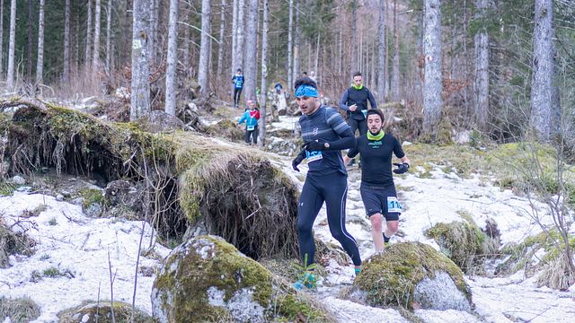 Manca purtroppo - quella sì - la neve, ed è un’assenza pesante. Val di Mello Winter Trail è nato due anni fa per correre con i ramponcini montati sulle scarpe da trail ma anche oggi (come era stato nel 2020) il terreno è fondamentalmente "green" (o quasi). I miei Nortec li ho messi ugualmente nello zaino, come augurio per… la terza edizione. Per quanto mi riguarda poi la veste autunnale dei sentieri non mi disturba, al contrario. Tanto più che l’impegno non viene… meno: la Val Masino e le sue valli laterali sono circondate (per non dire sovrastate) da pareti altissime e verticali, che incombono sui pochi villaggi e sulle quali sono state scritte alcune delle pagine più importanti dell’alpinismo e dell’arrampicata. In altri termini, molto più… pratici, tenendo presente che la traiettoria descritta dal sole nel cielo dei mesi invernali non è particolarmente accentuata, i raggi della nostra stella faticano a superare creste e pareti ed a raggiungere il fondovalle (dove corre il percorso) e di questi tempi non vi indugiano più di una manciata di ore. Risultato: il “lavoro” che non fa la neve lo fa… il ghiaccio. La sostituisce degnamente e ci costringe a fare extra-attenzione. Ce lo hanno detto nel briefing che ha preceduto lo scatto al via e ce lo ricorda, superato il traguardo-sprint di cui sopra (che rende omaggio al mitico “Fiorelli Sport” ed all’altrettanto mitico Bar Kundaluna) il primo assaggio di sentierino single-track appena fuori dal paese. Già dentro il bosco. Sono impegnato a non perdere le tracce della mia compagna di squadra Gloria (siamo in quattro, nel tricolore rosso-bianco-nero della Sportiva Lanzada) quando mi imbatto in Emanuele Manzi (uno dei top runners di cui sopra) con una manciata di neve ghiacciata premuta su un ginocchio… Meglio alzare ancora la soglia d’attenzione, ma solo dopo aver… abbassato la testa per evitare “craniate” nei brevi ma scenografici passaggi tra grandi massi che immettono nel tratto pianeggiante della località di Bregolana, l'habitat naturale del Gigiat, l’essere mitologico “locale” che ha dato il nome alla neonata società organizzatrice della prova: il Team Gigiat per l'appunto.