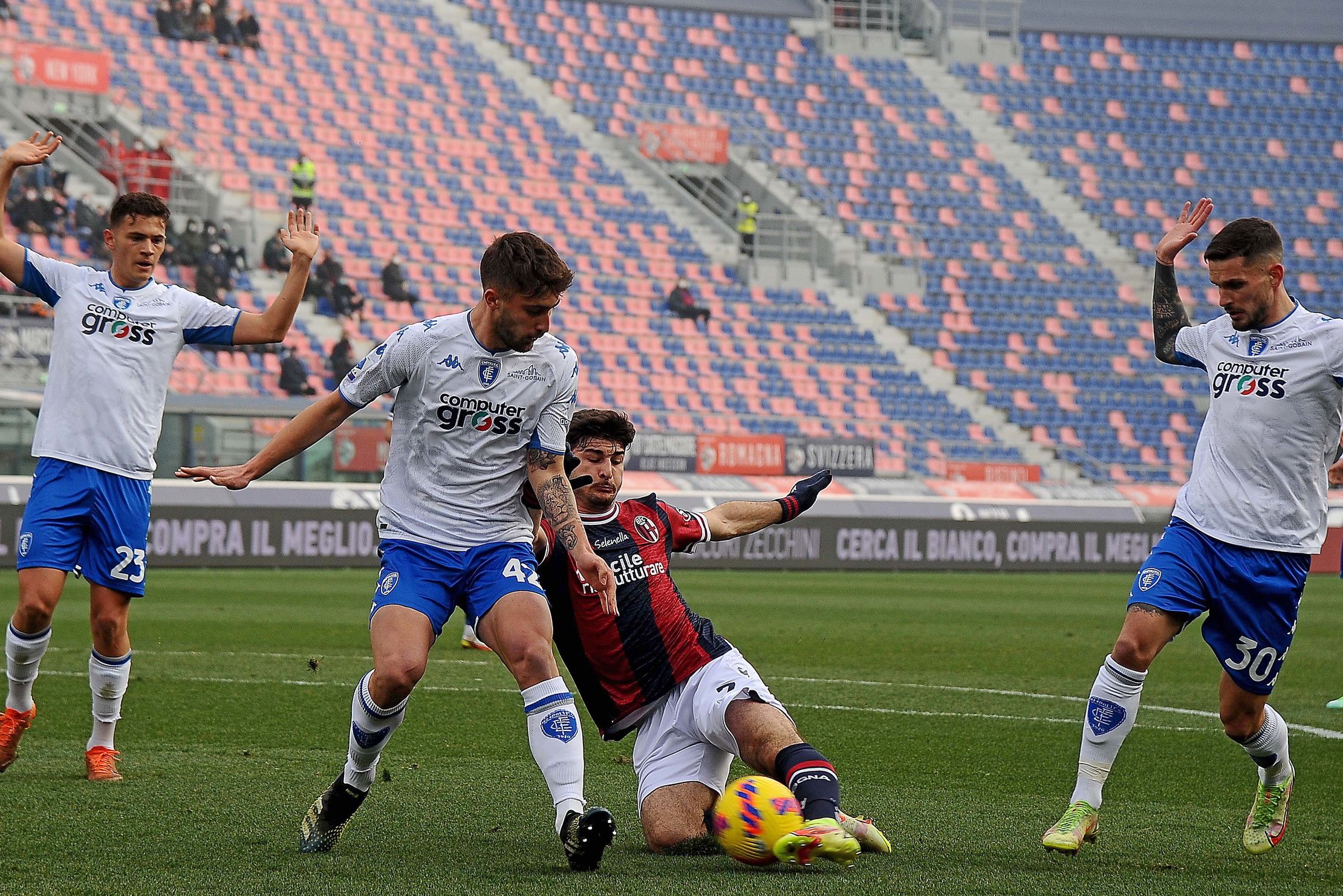 Mihajlovic ritrova Schouten dal 1' confermando Orsolini a sostegno di Arnautovic, mentre Andreazzoli recupera Parisi e sceglie di affidare ad Asllani le chiavi della regia che appartenevano a Ricci prima del trasferimento al Toro. Gli ospiti partono col piede sull'acceleratore, muovendo la palla a ritmi alti e schiacciando gli avversari nella propria trequarti. La manovra dei toscani fatica però a trovare sbocchi in area e col passare dei minuti i rossoblù riescono ad alzare il baricentro. La prima vera occasione del match è proprio dei felsinei, con un'incursione centrale di Soriano al 28', neutralizzata da un ottimo intervento di Vicario. La partita è molto equilibrata e combattuta a centrocampo, ma la chance più grande capita ancora ai padroni di casa, con un siluro dalla distanza di Arnautovic che si stampa in pieno sulla traversa a Vicario battuto. Poco prima dell'intervallo è l'Empoli ad andare a un passo dal vantaggio, ma il tocco sotto di Bajrami si spegne a lato di pochissimo e un primo tempo non privo di emozioni si chiude sullo 0-0.