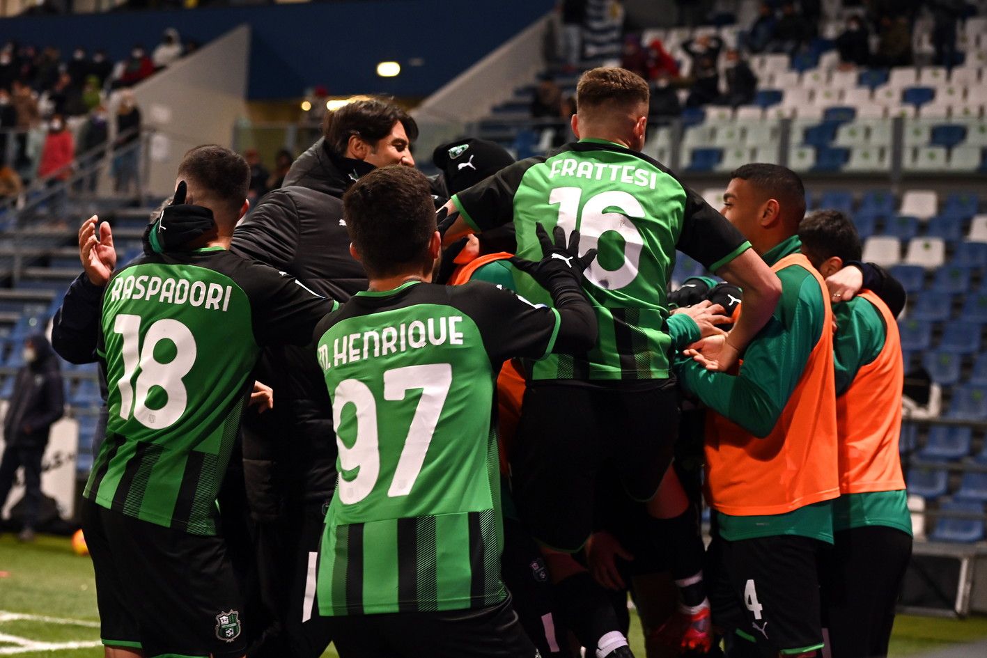 Sassuolo (4-2-3-1): Consigli 6,5; Muldur 6, Chiriches 6, Ferrari 6,5, Kyriakopoulos 6,5; Frattesi 6,5, Lopez 6,5; Berardi 7, Raspadori 6, Traorè 7 (23' st Henrique 6) ; Scamacca 5,5 (33' st Defrel 7).
