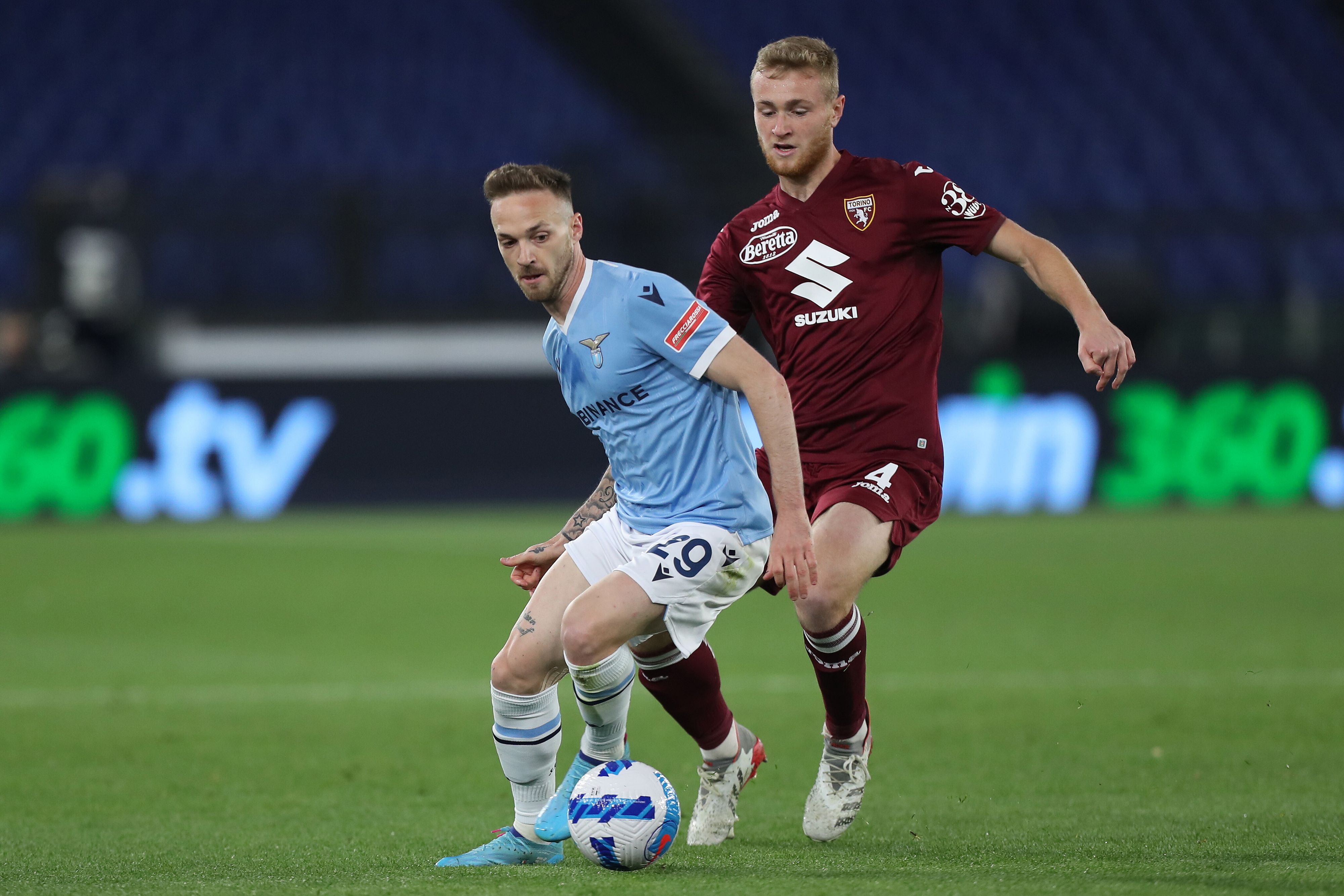 Sarri si affida all'undici previsto, con Felipe Anderson e Zaccagni ai lati di Immobile, mentre Juric rispolvera un po' a sorpresa Aina sulla corsia di sinistra, confermando Ricci in mediana. Le squadre si affrontano da subito a viso aperto e con buona intensità, ma faticando molto a presentarsi con pericolosità in area avversaria. La prima palla gol del match arriva solamente alla mezzora ed è per il Torino: sul corner perfetto di Rodriguez svetta Bremer, che colpisce di testa e centra in pieno il palo. Sul tap-in di Ricci è invece attento Strakosha. I granata ci credono e pochi minuti dopo sfiorano ancora il vantaggio, questa volta la palla buona è sul destro di Vojvoda, che però lo strozza troppo e conclude a lato di poco. L'unica buona chance per i padroni di casa arriva pochi minuti prima dell'intervallo, ma Berisha è reattivo sulla conclusione in spaccata di Milinkovic.