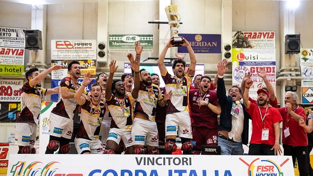 Un trionfo contro ogni pronostico. Il Sarzana di Mirko Bertolucci compie un miracolo e vince l’edizione numero 52 della Coppa Italia, imponendosi al Forte dei Marmi per 3-2, con la tripletta del catalano Joan Galbas. In un palazzetto pieno, con grande rappresentanza della tifoseria ligure, i rossoneri giocano una gara perfetta, portando i rossoblu all’overtime e castigandoli con un gol di rara bellezza di un indemoniato Galbas. Per il club del presidente Corona si tratta del primo successo importante dopo due Confederation Cup vinte nell’epoca pre covid. I rossoneri hanno sollevato il trofeo con grande merito, vincendo tutte le partite dopo l’overtime. Nei quarti eliminando 4-3 il Trissino, dominatore del campionato e in semifinale il Lodi (7-3), che lo scorso anno fu in grado di vincere il double, campionato - coppa. Alla vigilia i favori del pronostico pendevano inevitabilmente per il Forte, che passava in vantaggio con Marc Gual, I rossoblu dopo il gol per larghi minuti sembravano avere il possesso del match, ma il Sarzana ha mostrato un’ottima attitudine difensiva. La teoria che le grandi vittorie nascono dalla difesa viene confermata dai rossoneri, che brillano per organizzazione di gioco. Così dalle ripartenze di Joan Galbas nascono le due reti,, sempre dal vertice di destra, che chiudono il primo tempo sull’1-2. Nella ripresa una magia di Xavi Rubio rimette il match in parità, poi, a parte un palo di Gual e un miracolo di Gnata su Rossi, si transita piacevolmente all’overtime, dove una bomba di Joan Galbas regala la coccarda tricolore al Sarzana. La festa dei liguri è durata l’intera notte, mentre Mirko Bertolucci fine match è incontenibile “È stata una vittoria del gruppo, del lavoro e del sacrificio. Ma devo ringraziare mio fratello Alessandro, che mi ha preparato la strada. Alla vigilia ero sicuro dei miei ragazzi, abbiamo mostrato una grande condizione fisica e mentale: non si battono Trissino, Lodi e Forte, sempre fuori casa, sempre dopo i supplementari”. Per Bertolucci è il primo trofeo da allenatore, dopo aver vinto 7 Coppe Italia in 14 finali da giocatore in grado di spostare gli equilibri in pista.