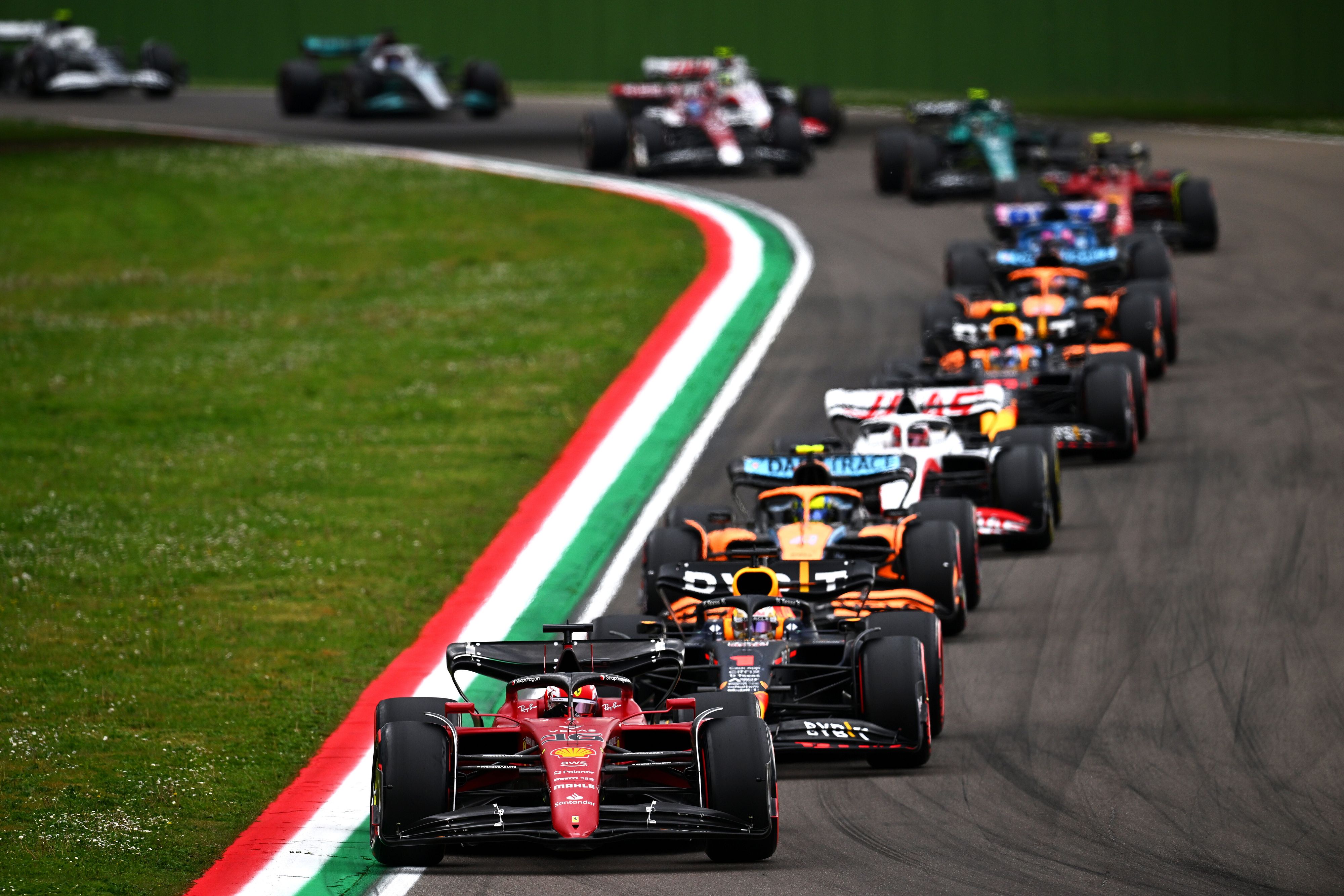 Leclerc scatta meglio di Verstappen e prende la testa della gara davanti all’olandese ed a Norris che non riesce ad approfittare della partenza imperfetta del campione del mondo. Battaglia serrata tra Perez, Ricciardo e Magnussen al Tamburello ma passano tutti e tre. Alonso perde un paio di posizioni. Safety car per l’uscita di pista di Guanyu Zhou alla Piratella dopo un contatto con Pierre Gasly. La gara riparte al quinto dei ventuno giri in programma: Leclerc tiene la prima posizione. Al settimo passaggio Sainz supera Alonso e sale al settimo posto (tre guadagnati dal via), all’ottavo Perez supera Magnussen davanti ai box per il quarto. Il danese scala poi in settima posizione, superato anche da Ricciardo e Sainz.