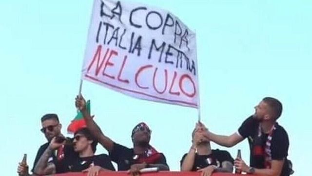 La Procura della Federcalcio ha aperto un'inchiesta "per presunta violazione dell'art 4 del Codice di giustizia sportiva" (che impone il rispetto dei principi di correttezza e lealtà, ndr) per lo striscione esposto dai calciatori del Milan nel corso della celebrazione della vittoria dello scudetto. Durante il tragitto dei bus scoperti verso il centro di Milano è spuntato il messaggio "La Coppa Italia mettila nel c...", presa in giro all'Inter che richiama quella del 2007 quando Ambrosini aveva tenuto in mano uno striscione con scritto "Lo scudetto mettilo nel c..." (i nerazzurri avevano vinto il campionato, i rossoneri la Champions).