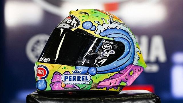 Spiaggia e mare, un casco dedicato all'estate per Andrea Locatelli. Il pilota superbike della Yamaha ha scelto una livrea speciale per la gara di casa a Misano. Come lo scorso anno a realizzarla Massimo Dante, in arte Mad56, che ha colorato l'Airoh del numero 55 con il suo iconico stile cartoon.