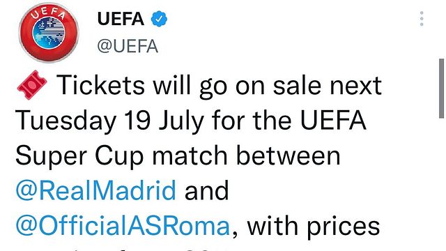 Il tweet è stato subito eliminato dalla Uefa e sostituito con quello corretto. La vendita dei biglietti per la partita comincerà il 19 luglio e i tifosi sono già in attesa.