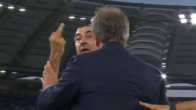 Nervosismo all'Olimpico durante la partita tra Lazio e Verona vinta dai biancocelesti 2-0 con le reti di Immobile e Luis Alberto. In particolare il tecnico laziale Maurizio Sarri ha perso le staffe e ha fatto il gesto del dito medio rivolgendosi alla panchina dell'Hellas. Come è poi stato chiarito dallo stesso tecnico laziale in conferenza stampa, il gesto era indirizzato al ds dell'Hellas Francesco Marroccu: "Il direttore - ha precisato Sarri - lo conosco da tanti anni. Ho avuto l’impressione che mi avesse detto di mettermi seduto, allora ho risposto. Poi abbiamo chiarito e abbiamo riso sopra l’episodio. Lui mi aveva detto di stare calmo, non di mettermi seduto”.