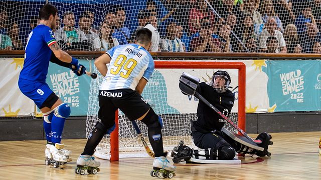 Bertolucci rispetto al quarto contro Angola rimette tra i pali Ricky Gnata e il portiere del Forte dei Marmi si esibisce in risposte da applausi. In quintetto c’è anche il giovane Gavioli, insieme a Ipinazar, Ambrosio e Cocco. Argentina ripropone gli stessi cinque visti fino a qui, con Pablito Alvarez e tre vecchie conoscenze italiane: Matias Platero, Lucas Ordonez e Gonzalo Romero. Il primo sussulto è al 10’, con un botta e risposta tra Alvarez e Gavioli. Un attimo più tardi s’infortuna Pascual. Nel mentre scaturisce un conciliabolo acceso tra Romero e Ipinazar, espulsi temporaneamente, mentre viene rifilato un cartellino rosso ad un componente dello staff argentino. Per 2’ si gioca 3 contro 3 e Verona ha una grande possibilità, ma è la traversa a strozzargli l’urlo in gola. Terminata la doppia reciproca inferiorità senza altre emozioni, ci sono 4 minuti di penalità per il rosso alla panchina. Ma un monumentale Acevedo chiude gli spazi a Verona, Cocco e due volte a Malagoli. Alla sfida a distanza tra portieri si iscrive anche Gnata, che al minuto 19 para un tiro diretto per blu a Cocco e la ribattuta di Mena. Nel conseguente powerplay Romero porta in vantaggio l'Argentina con un tiro dalla media distanza. L’Italia abbassa i ritmi, ma il raddoppio dell’Albiceleste matura su rigore a soli 7 secondi dalla sirena di metà gara, con una carambola che sfavorisce il portiere azzurro.