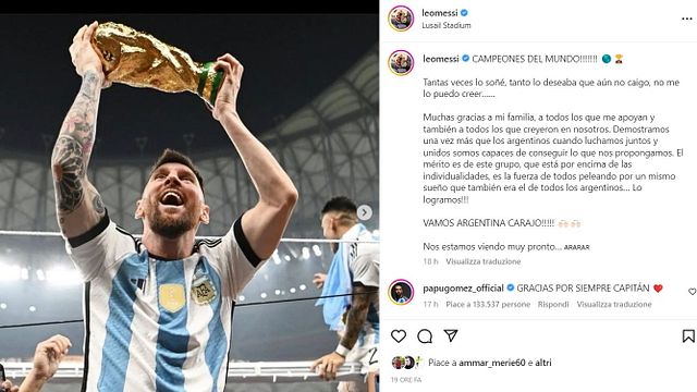"L'ho sognato tante volte, l'ho voluto così tanto che ancora non ci posso credere… - ha scritto il fuoriclasse argentino - Grazie mille alla mia famiglia, a tutti coloro che mi supportano e anche a tutti coloro che hanno creduto in noi. Dimostriamo ancora una volta che noi argentini quando combattiamo insieme e uniti siamo in grado di raggiungere ciò che ci siamo prefissati. Il merito è di questo gruppo, che è al di sopra delle individualità, è la forza di tutti che lottano per lo stesso sogno che era anche il sogno di tutti gli argentini... Ce l'abbiamo fatta!!!".