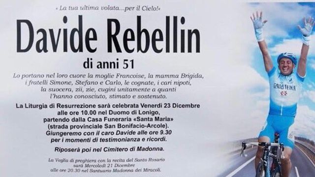 Ultimo saluto a Davide Rebellin. Si sono svolti nel duomo di Lonigo i funerali dell'ex campione di ciclismo morto il 30 novembre scorso a Montebello dopo essere stato investito da un mezzo pesante mentre si allenava in bici. Alla funzione tanti amici ed ex compagni, da Gianni Bugno a Claudio Chiappucci. In chiesa Gilberto Simoni ha voluto esprimere la sua rabbia con un discorso: "Mi vergogno dello stato italiano, non fa niente per fermare queste stragi sulla strada".