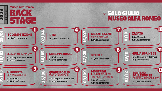 Il Quadrifoglio, Autodelta, la Giulia Sprint GT, Giuseppe Busso, il campionato DTM: sono alcuni temi al centro delle conferenze mensili Backstage 2023, una rassegna avviata quattro anni fa dal Museo di Arese per approfondire la storia Alfa Romeo attraverso gli oggetti della Collezione conservati "dietro le quinte". Si parte a gennaio con una giornata dedicata alla 8C Competizione, a 20 anni dalla presentazione al Salone di Francoforte, per proseguire a febbraio con un altro anniversario, il 40° della best seller Alfa 33, una tra le Alfa Romeo più vendute di sempre.
