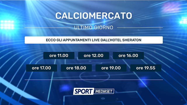 Ultimo giorno di mercato e tante trattative ancora aperte. Dall'hotel Sheraton di Milano i nostri inviati Claudio Raimondi, Daniele Miceli e Simone Redaelli si collegheranno in diretta per aggiornarvi su tutti gli affari in corso. Gli appuntamenti ogni ora in streaming sul nostro sito e sulla nostra app per non perdere nessun colpo di mercato.