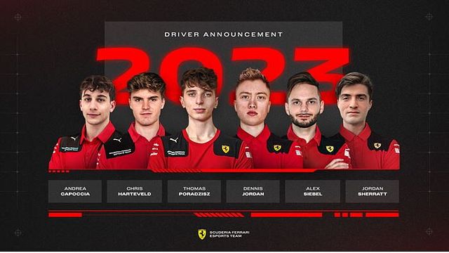 Quattro i piloti impegnati nei campionati della galassia SRO Esports sulla piattaforma di Assetto Corsa Competizione con la nuovissima Ferrari 296 GT3: si tratta di Jonathan Riley, britannico classe 2003, fresco vincitore della Ferrari Esports Series 2022 già annunciato insieme a Longuet e Broumand; di Jordan Sherratt, sudafricano nato nel 1999 vincitore della SimGrid World Cup 2020, della Raceface Endurance Series 2021 e quinto nel campionato GT World Challenge Sprint 2022; di Chris Harteveld, olandese del 2001, vincitore in classe Silver del GT World Challenge America 2022, e di Andrea Capoccia, italiano classe 1997 trionfatore nel 2021 del campionato SimGrid Endurance. Tutti saranno impegnati nelle gare del campionato Intercontinental GT Challenge Esports (questo il calendario: 20/5 12 Ore di Bathurst; 17/6 9 Ore di Kyalami; 15/9 24 Ore di Spa-Francorchamps; 19/8 10 Ore di Suzuka; 16/9 8 Ore di Indianapolis), mentre Harteveld e Sherratt saranno anche protagonisti della SRO Esports Sim Pro Series (gare in presenza con questo calendario: 23/4 Monza; 3/6 Paul Ricard; 30/6 Spa-Francorchamps; 29/7 Nürburgring; 30/9 Barcellona). Jordan sarà lo stakanovista del gruppo dal momento che sarà impegnato anche nella SRO America Sprint Series (6/5 Laguna Seca; 10/6 Circuit of the Americas; 22/7 Silverstone; 5/8 Watkins Glen; 2/9 Indianapolis).