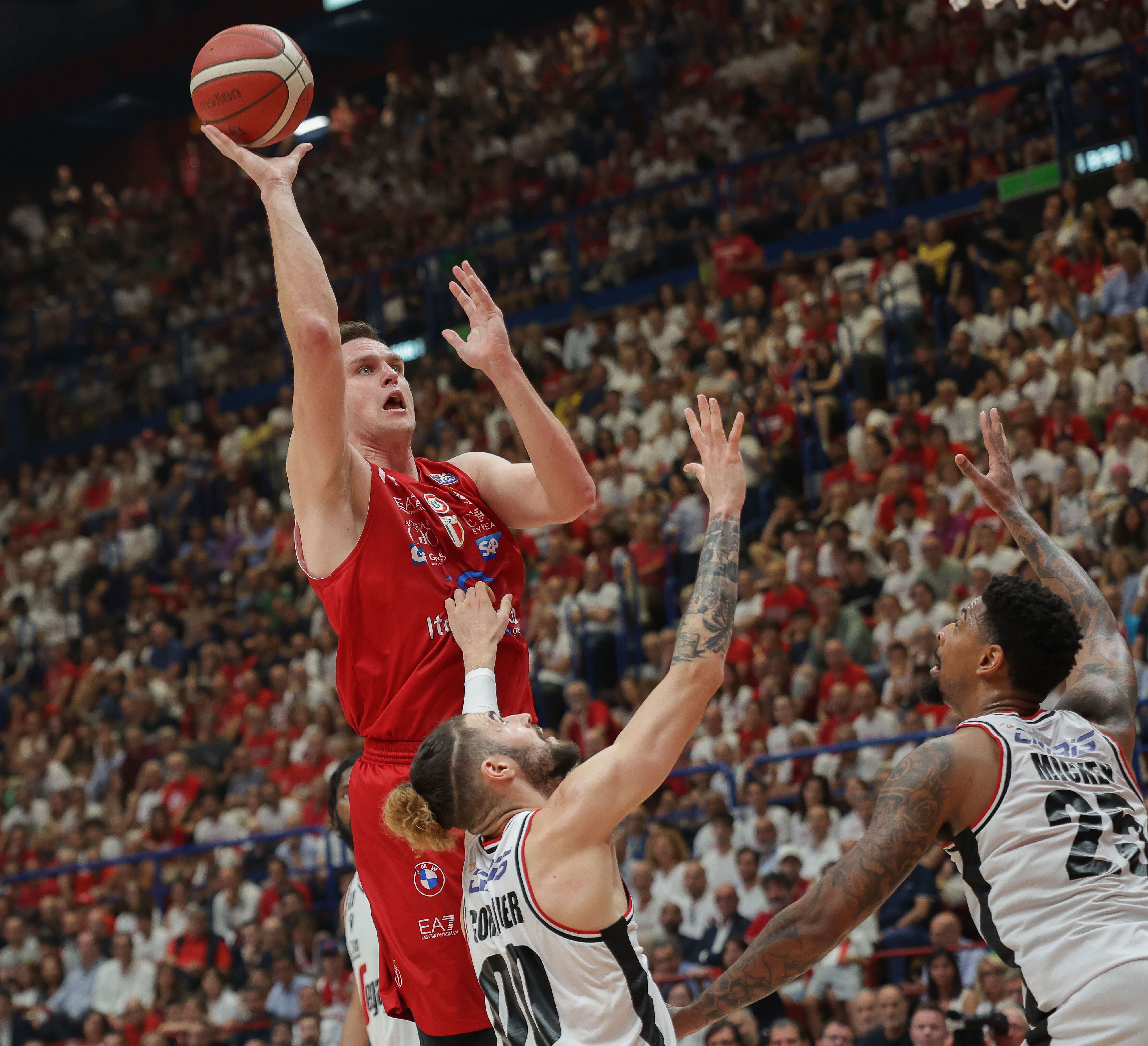 Gara-5 della finale scudetto della Serie A di basket sorride all'EA7 Emporio Armani Milano, che fa esplodere il Forum: l'Olimpia vince 79-72 e si porta sul punteggio di 3-2, interrompendo la serie vincente dei rivali. Il primo scatto è della formazione meneghina, che si porta sul punteggio di 11-5. La Virtus, con un grande Belinelli, si riporta sul punteggio di parità (12-12), ma Shields ristabilisce un margine di sicurezza per l'Olimpia sul +4 (20-16). Ojeleye lo scalfisce con una tripla, ma Hines e Baron fanno nuovamente scappare Milano. Il primo quarto si chiude sul 26-24 per l'EA7 Emporio Armani, con la tripla di Pajola ad accorciare le distanze sulla sirena. L'avvio del secondo quarto ci fa assistere al pareggio di Jaiteh, ma la Virtus si perde e viene travolta dai rivali: Baron è il trascinatore dell'Olimpia, che si porta sul +9. Il parziale di 9-0 viene interrotto dalla tripla di Cordinier e la partita torna combattuta, con Hackett che riporta la Virtus sul -4 (38-34). Si va al riposo sul 42-37 per Milano, coi canestri di Voigtmann e Mickey a stabilire le distanze e una statistica sconfortante per i bolognesi: 26.6% di efficacia da tre.