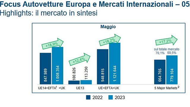 Il mercato dell'automobile continua a crescere, inesorabilmente, in tutta Europa. I dati Anfia (associazione nazionale filiera industria automobilistica) del mese di maggio analizzano un +18,5% complessivo. Il primato va alla Germania con 246.966 veicoli immatricolati nel solo mese di maggio. L'Italia conferma l'ottimo trend del 2023 e si piazza in seconda posizione con 149.373 macchine vendute. Quattro mila in più della Francia che segue in terza piazza.