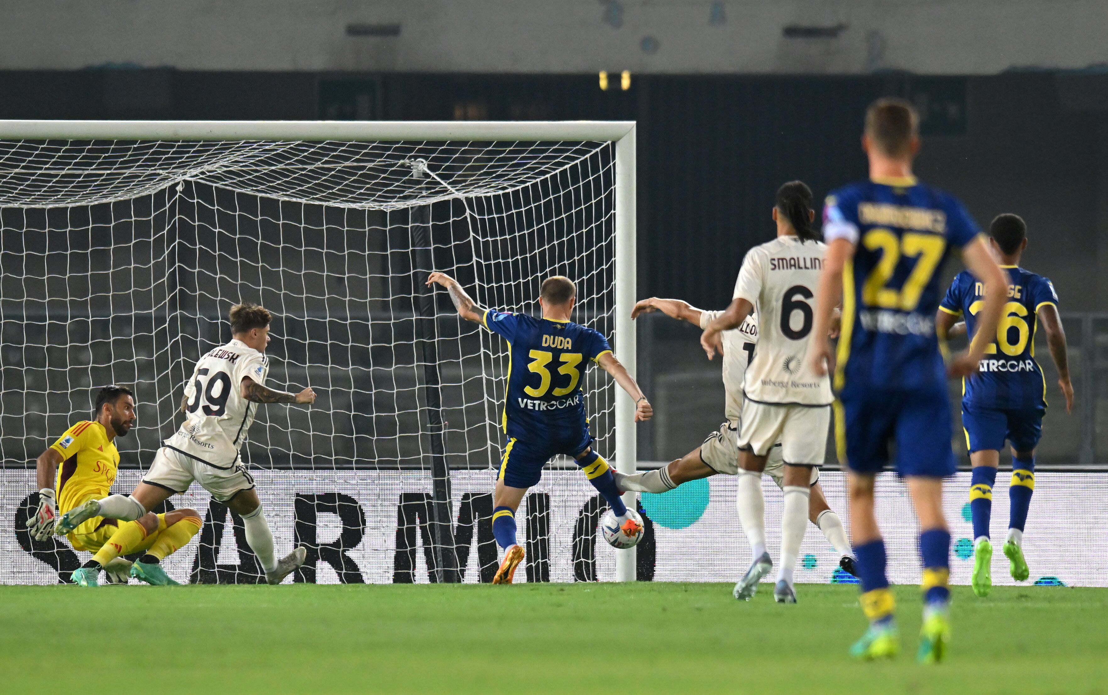 La Roma cade 2-1 contro il Verona nella seconda giornata di Serie A e resta inchiodata a quota 1 punto in classifica. I giallorossi vengono puniti dopo appena 4' da una zampata di Duda, che approfitta di un mezzo pasticcio di Rui Patricio, poi sprecano tanto e nel recupero del primo tempo incassano il raddoppio in contropiede, firmato da Ngonge. A inizio ripresa il neo entrato Aouar (56') accorcia le distanze, a pochi minuti dalla fine i padroni di casa restano in 10 per il rosso a Hien, ma nonostante il lungo assedio finale nel quasi quarto d'ora di recupero il risultato non cambia. I ragazzi di Baroni vanno a dormire da capolisti a pari punti col Milan.
