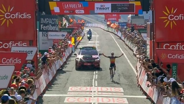 La quattordicesima tappa della Vuelta 2023 segna il riscatto di Remco Evenepoel. Dopo aver incassato 27 minuti sul Col du Tourmalet, il belga della Soudal Quick-Step domina i 156,5 km successivi, arrivando indisturbato al traguardo di Larra-Belagua. Emozione prima e lacrime all'arrivo per il campione del Mondo in carica a cronometro, che ottiene la sua seconda vittoria di frazione dopo la Suria-Arinsal. Per il suo team, invece, è il successo numero 45 nel 2023.