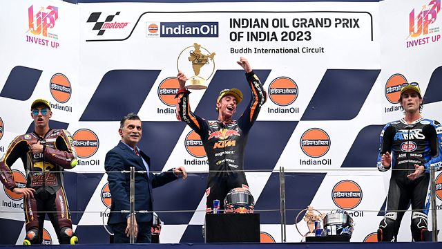 Pedro Acosta vince anche il GP d'India, conquista il sesto successo stagionale nel Mondiale Moto2 (il secondo di fila dopo il trionfo di Misano) e allunga ulteriormente in vetta alla classifica iridata. Sono ora 39 i punti che lo separano da Tony Arbolino, 2° al traguardo e capace finalmente di riassaporare la gioia del podio dopo un periodo complicato. Alle spalle del pilota di Garbagnate chiude Joe Roberts, che strappa il 3° posto a Sergio Garcia dopo uno splendido duello.