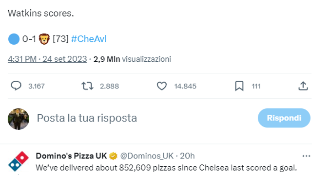 Cinque punti in sei partite di campionato: in casa Chelsea è già bufera. La gestione Pochettino non ha portato la tanto attesa svolta, anzi: i numeri dell'attacco Blues , nonostante i 462 milioni di euro spesi sul mercato in estate, sono da brividi. Zero gol realizzato nel mese e situazione peggiorata ieri dopo la sconfitta casalinga al cospetto dell'Aston Villa di Zaniolo. A decidere la sfida Watkins, ea ironizzare sulla rete della punta inglese è stata pura Domino's Pizza.