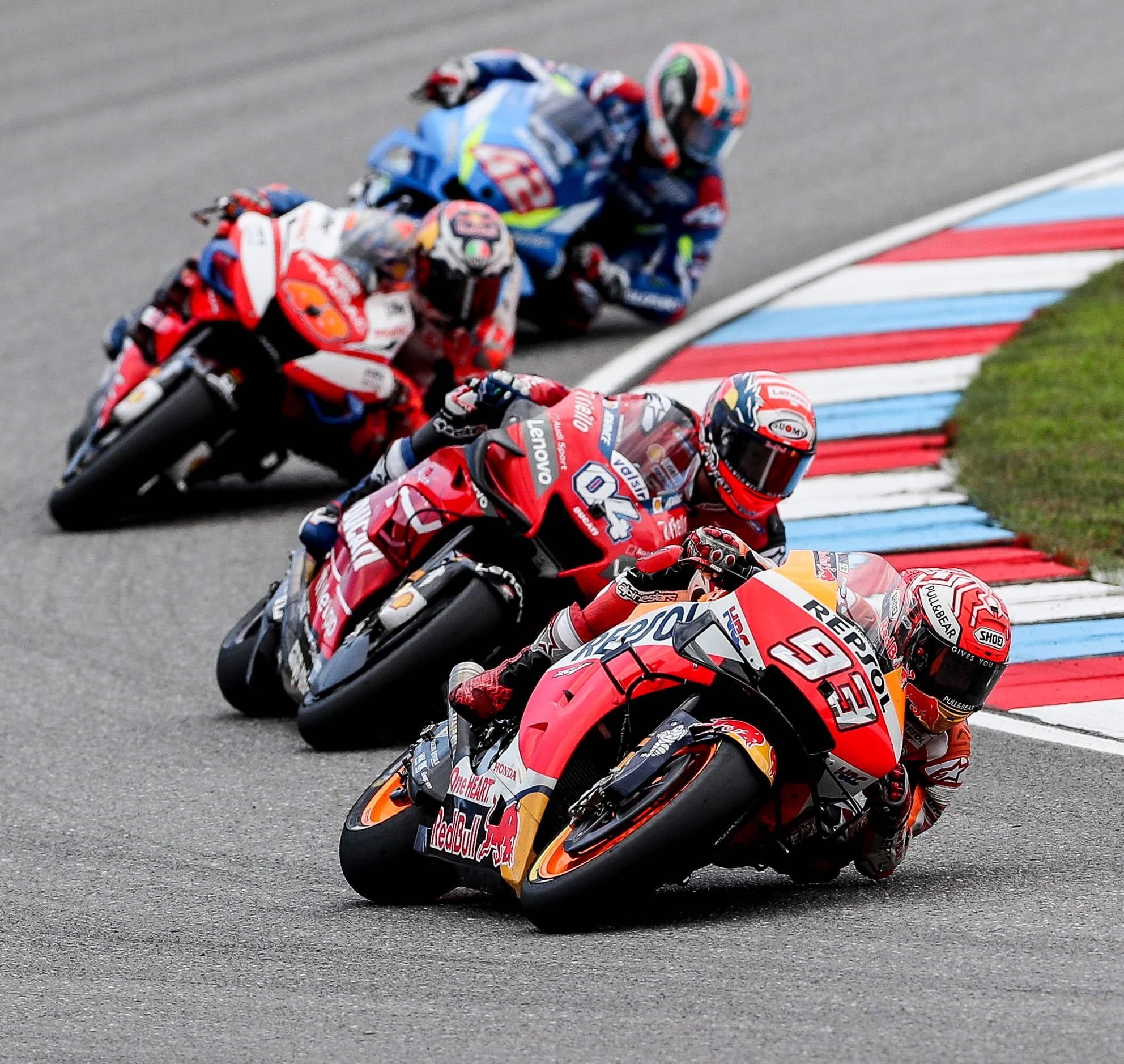 Dopo il capolavoro in qualifica, Marquez ha continuato a dettare la sua legge con l'ennesima cavalcata trionfale, nonostante un avvio un po' turbolento. La partenza era infatti stata ritardata di circa 40 minuti (e il GP accorciato di 1 giro) a causa dell'acquazzone improvviso abbattutosi sul tracciato poco dopo la fine della gara di Moto2. Le condizioni miste hanno spinto i commissari ad attendere che la pista si asciugasse del tutto, per evitare rischi al via. Allo spegnimento dei semafori, però, non ce n'è stata per nessuno: il 7 volte iridato si è messo a dettare il ritmo, Dovizioso ha provato a tenerlo per due terzi di gara, ma alla fine ha dovuto arrendersi e accontentarsi del secondo posto.