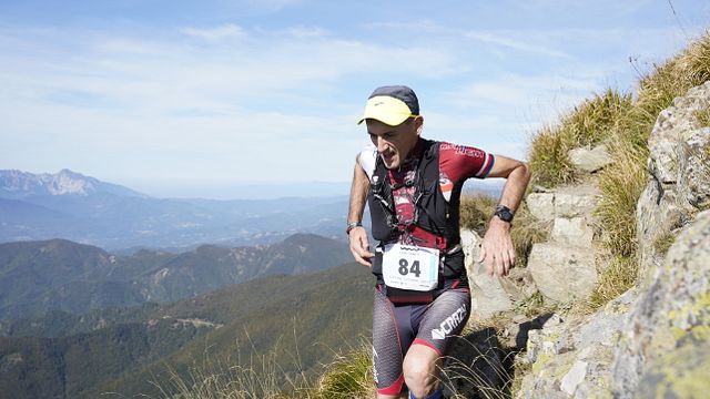 La cavalcata lungo lo spartiacque tra Emilia-Romagna e Toscana copre tutta la parte centrale della prova: una decina di chilometri circa, vale a dire un terzo della distanza. Una linea continua interrotta solo da una breve ma importante divagazione. Subito dopo Cima dell’Omo (1860 metri) infatti appoggiamo sul versante sud per una sorta di... enclave emiliana in territorio toscano, alla cui quota più bassa (siamo in provincia di Lucca) si trova il ristoro di Bivacco Caciaia. Poco dopo aver riattaccato la salita per riguadagnare il crinale, entriamo “dritto per dritto” in un canyon che - appena inquadro dal basso - mi fa trasalire: Oh, Gesù… Sale con fondo di grossi massi tra due pareti di terra ed erba. In alto sbocca pochi metri sotto il crinale ma il sentiero in quel punto ruota di novanta gradi verso Passo della Porticciola ed è un niente - nell’inversione - per smuovere un sasso. Detto fatto: qualcuno ne fa partire verso il basso uno bello grosso, grande come un pallone da rugby che sibila giù ruotando sul suo stesso asse e alla velocità di un proiettile. Mi fermo "impietrito" (è proprio il caso di dirlo!) e cerco di mettermi al riparo perché se mi prende mi stacca la testa ma... come fai a sapere che traiettoria prenderà il “meteorite” al suo prossimo impatto? Ok, è andata bene, passa tre o quattro metri più in là e si ferma una cinquantina di metri più sotto, risparmiando anche chi mi segue…