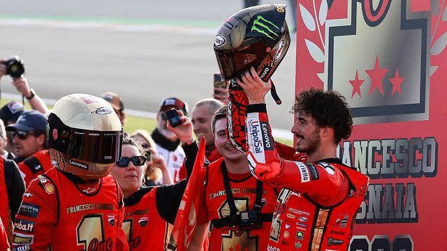 "Aver usato la media ieri ci ha creato problemi nella Sprint ma almeno oggi, riutilizzandola, ne conoscevamo già il comportamento, quindi è stato un aiutino. La scorsa notte però non ho dormito granché ma... va bene uguale. Un anno fa avevo sentito molto di più la pressione, la situazione era più complicata. Quest'anno ero più rilassato, sapevo che di domenica siamo i più forti. Al via mi sono messo davanti ma poi ho sentito che c'era qualcosa che non andava con le gomme, quindi ho fatto passare le KTM. Nel finale la temperatura si è abbassata e avevo un po' di paura per la gomma davanti, soprattutto dopo aver visto Miller volare via. Poi per fortuna è andato tutto bene.Non stavo pensando troppo al Mondiale Non sapevo che Martin fosse uscito, quindi sono rimasto sul chi vive fino alla fine. Il contatto con Martin ad inizio gara? È successo quello che era successo a me con Di Giannantonio in Qatar. L'incidente di Barcellona è stato un intoppo non da poco: non tanto subito dopo a Misano (dove è stata dura ma lo abbiamo tenuto più o meno nascosto), quanto nelle gare successive. Non abbiamo mai perso performance sul Gran Premio della domenica ma abbiamo perso smalto nel time attack e nell'esplosività: quindi in qualifica e nelle Sprint del sabato e sono qualità che dobbiamo ritrovare".