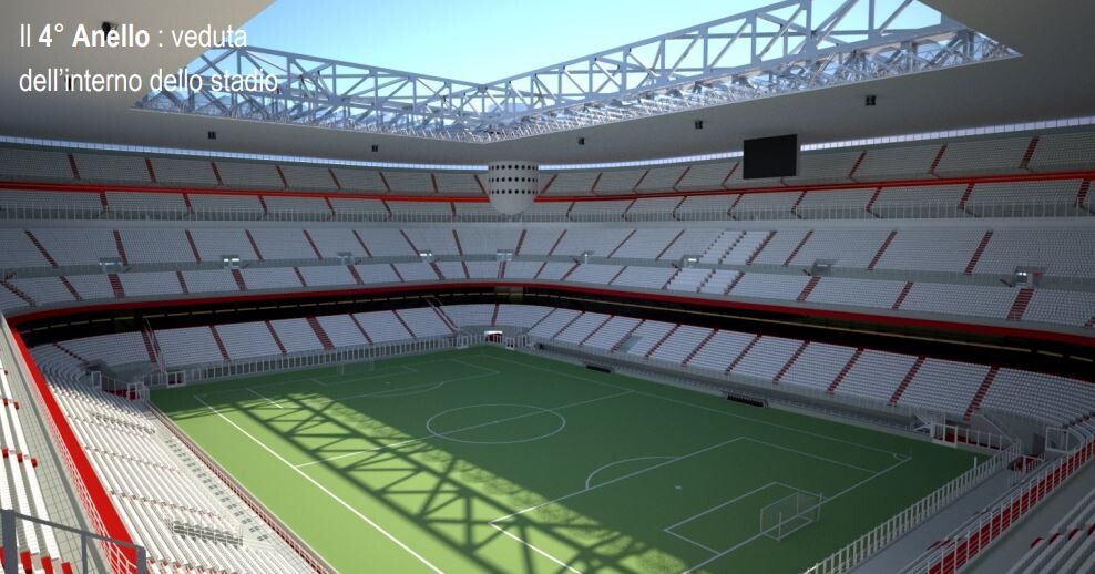 Il 4° Anello: nuove aree per ospiti, vip, aree comuni, bar, servizi, e meeting. Il progetto prevede l’inserimento di un nuovo corpo di due piani praticabili in virtù della parziale demolizione delle tribune del primo anello. Lungo una superficie di 10 230 mq da moltiplicare per 2, quindi 20.460 mq, potranno essere disposti e organizzati tutti quei servizi integrativi alla tradizionale fruizione degli eventi. Questo quarto anello, si raggiunge velocemente dall’esterno attraverso nuovi corpi scala e ascensore e si troverebbe alla quota ideale per la migliore visibilità del campo. Altrettanto veloce sarebbe l’evacuazione. La coerenza con il passo strutturale delle campate esterne (che reggono il secondo anello) permette una piena modularità e quindi flessibilità funzionale nonché una relativa “facilità” costruttiva.