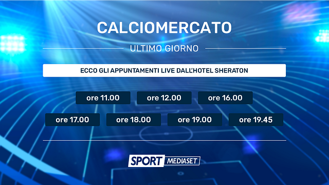 Ore caldissime per gli ultimi colpi della sessione invernale del calciomercato, che è iniziata lo scorso 2 gennaio e che si chiude oggi alle ore 20. Restate connessi sul nostro sito per tutti gli aggiornamenti in tempo reale con i nostri esperti di mercato Claudio Raimondi e Daniele Miceli, che si trovano all'hotel Sheraton di Milano da dove si collegheranno in diretta streaming su Sportmediaset.it alle 11, alle 12, alle 16, alle 17, alle 18, alle 19 e infine alle 19.45 per la volata finale: in ogni collegamento live gli affari più caldi e i retroscena delle trattative.