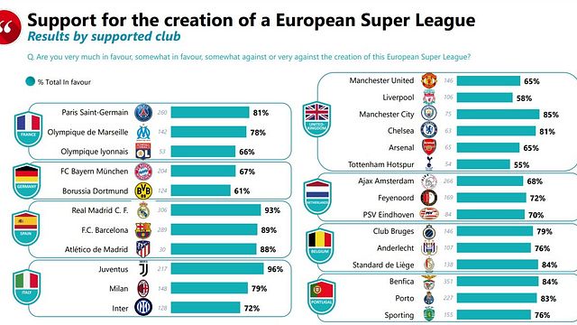In totale, il 72% di tutti i tifosi intervistati di otto grandi Paesi europei concorda con la creazione di una Superlega europea, con Spagna (84%), Portogallo (81%) e Italia (80%) tra i più favorevoli. In altri Paesi, l'idea di creare una Superlega è comunque accolta favorevolmente dalla maggioranza dei tifosi. Tra questi, il 75% in Francia e Belgio, il 67% nei Paesi Bassi, il 65% nel Regno Unito e il 61% in Germania.
