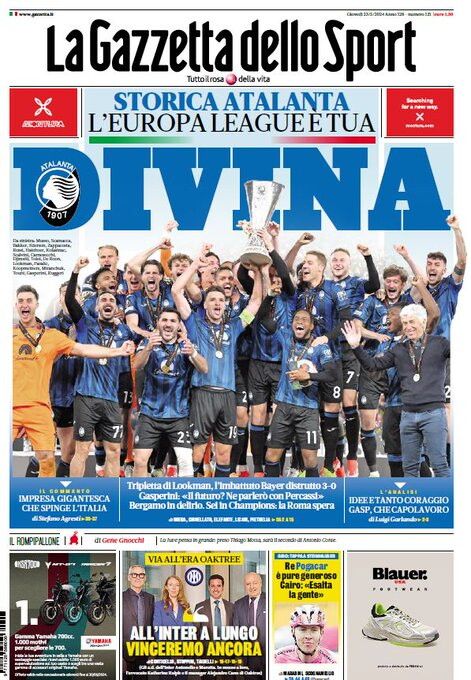 L'Europa celebra l'Atalanta. I giornali esteri rendono omaggio al trionfo della Dea nella finale di Europa League contro il Bayer Leverkusen, campione di Germania che era imbattuto da 51 partite. Il quotidiano spagnolo As dedica uno spazio in prima pagina e titola: "Lookman tortura Xabi Alonso". Marca dedica alla vittoria della squadra di Gasperini il taglio alto: "L'Atalanta lascia senza corona europea Xabi". Sempre in Spagna, El Mundo Deportivo riserva alla vittoria dell'Atalanta il taglio basso: "Lookman rompe il filotto di Xabi". Il francese L'Equipe in prima pagina mette una foto dell'esultanza di Lookman dopo un gol titolando: "Il muro dell'Atalanta". Sul britannico I Sport, invece, "Lookman conquista Leverkusen". L'olandese Sportwereld pubblica l'abbraccio tra Koopmeiners e Lookman e titola: "Primato". Il tedesco Kicker parla di "Doppia ferita". Infine il portoghese A Bola: "Lookman che distrugge gli invincibili".
