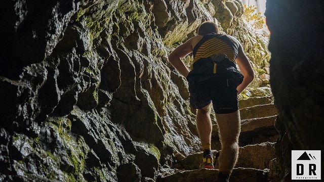 Anche se privo di dislivelli significativi (è un lungo traverso a mezza costa su sentiero single track), quello che dalla “rampa di lancio” della Terrazza Salomon porta al Passo Dordona è un tratto piuttosto “sky”, nel senso che non ci si possono concedere distrazioni anche se io - appena lo avvisto acquattato ai bordi del sentiero - saluto l’amico fotografo Cristian Riva (con lui e con il suo socio Diego De Giorgi mi ero intrattenuto prima del via) e mi atteggio un po’ per lo scatto, sforzandomi di distendere i tratti del volto in un sorriso che rimane comunque un po’ tirato. Poco sotto il valico il sentiero si allarga per poche centinaia di metri in strada bianca (quella che collega Val Brembana e Valmadre), perché al passaggio sul valico svoltiamo per imboccare la storica trincea e il camminamento indoor di cui all’inizio. Per breve che sia - come anticipato - sono certo non avrà lasciato indifferente nessuno di noi.