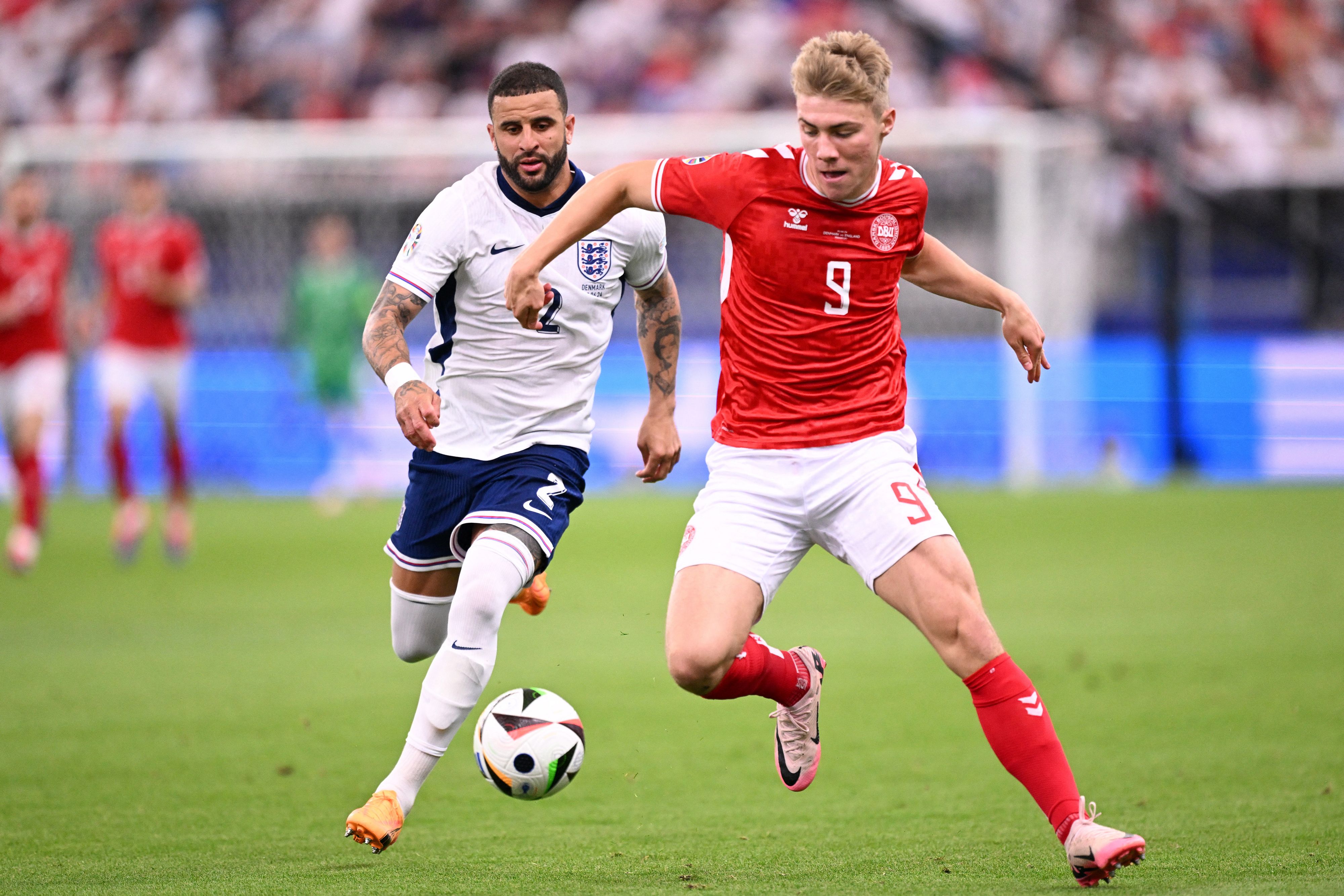 Southgate conferma in toto il 4-2-3-1 dell'esordio vincente con la Serbia, mentre Hjulmand sceglie di lanciare dal 1' Maehle sulla corsia sinistra, con l'altro ex atalantino Hojlund come riferimento offensivo. I ritmi in avvio sono piuttosto bassi, la prima occasione se la costruisce da solo Foden al 13', ma il suo sinistro è sbilenco e alto sopra la traversa. Gli uomini di Southgate tengono il possesso senza grandi idee, ma al 18' arriva il regalo della difesa danese che sblocca l'incontro: Kristiansen si addormenta incredibilmente su un pallone innocuo facendosi beffare alle spalle da Walker, che crossa in mezzo e pesca Kane dopo un dopppio rimpallo fortunoso, il capitano a quel punto non deve far altro che appoggiare in rete l'1-0. La Danimarca tenta di reagire subito, alza il proprio baricentro e dopo un paio di assalti andati a vuoto trova la rete dell'1-1: l'azione nasce da un erroraccio in fase di disimpegno di Kane, ma il gol è tutto di Hjulmand, che trova l'angolino con un gran destro dalla distanza. La nazionale dei Tre Leoni appare confusa e spaesata, Bellingham non trova mai varchi per gli inserimenti, Foden si accende solo a folate e il primo tempo si chiude senza altre emozioni.