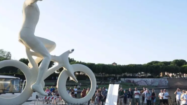 Un colosso alto cinque metri e largo quattro, è Marco Pantani immortalato con le braccia aperte, in bicicletta sul traguardo di Oropa, nel giugno del 1999. La nuova installazione dedicata al Pirata del ciclismo è stata inaugurata ieri sera a Rimini e accoglie lo storico arrivo della prima tappa del Tour de France. La città dove 20 anni fa Pantani morì lo celebra così con un omaggio alla sua figura, che fissa per sempre la silhouette del campione di Cesenatico vicino al bimillenario Ponte di Tiberio.