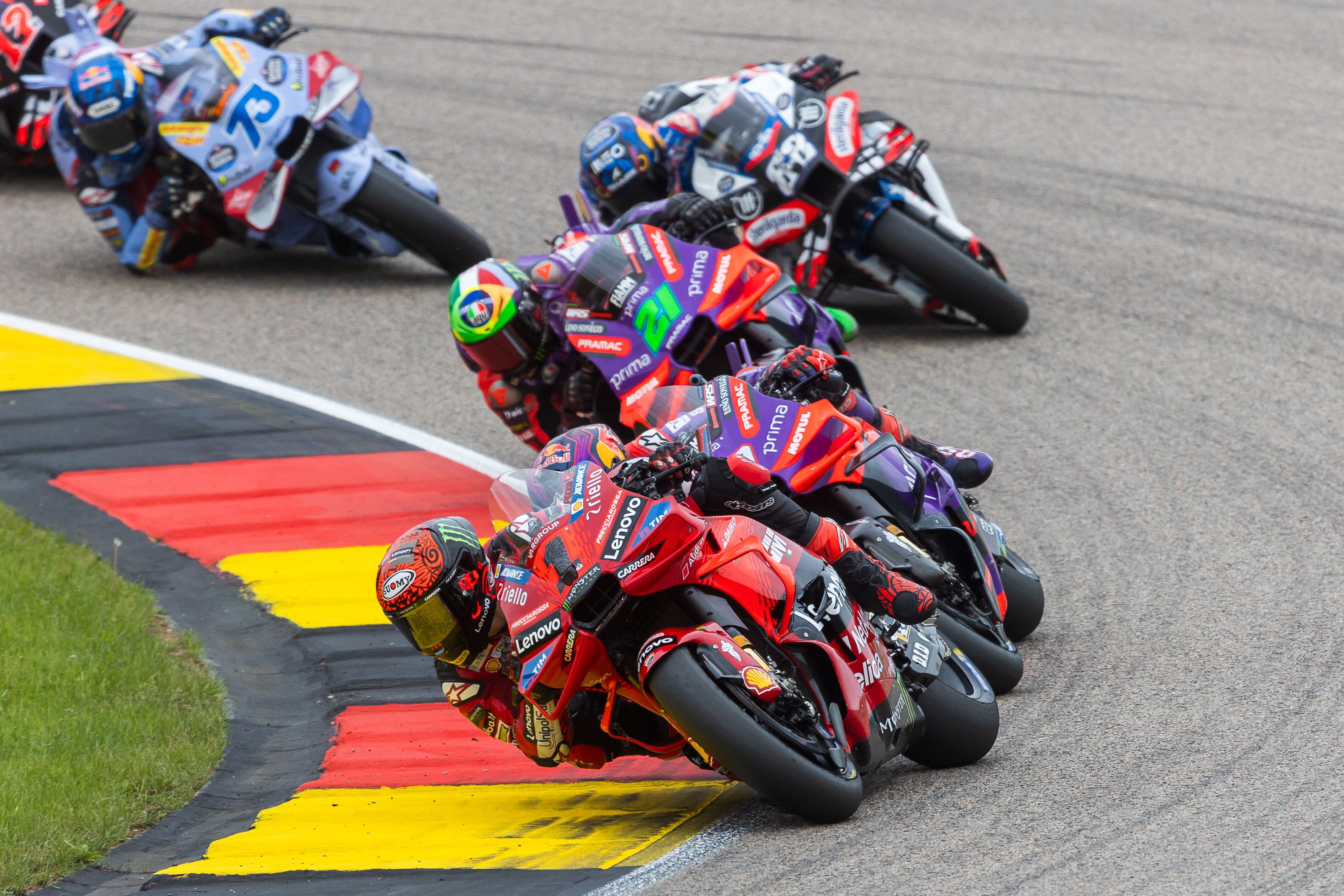 Francesco Bagnaia ha vinto il GP di Germania e conquistato il suo sesto successo stagionale in MotoGP, il quarto consecutivo in una gara completa. Il pilota Ducati ufficiale ha approfittato al massimo della clamorosa scivolata di Jorge Martin, finito a terra mentre era in testa a due giri dalla fine, tagliando il traguardo per primo e sorpassando il rivale in vetta alla classifica iridata. A completare il podio i fratelli Marquez con le Ducati del team Gresini: Marc, autore di una spettacolare rimonta, ha battuto Alex nel finale per il 2° posto.