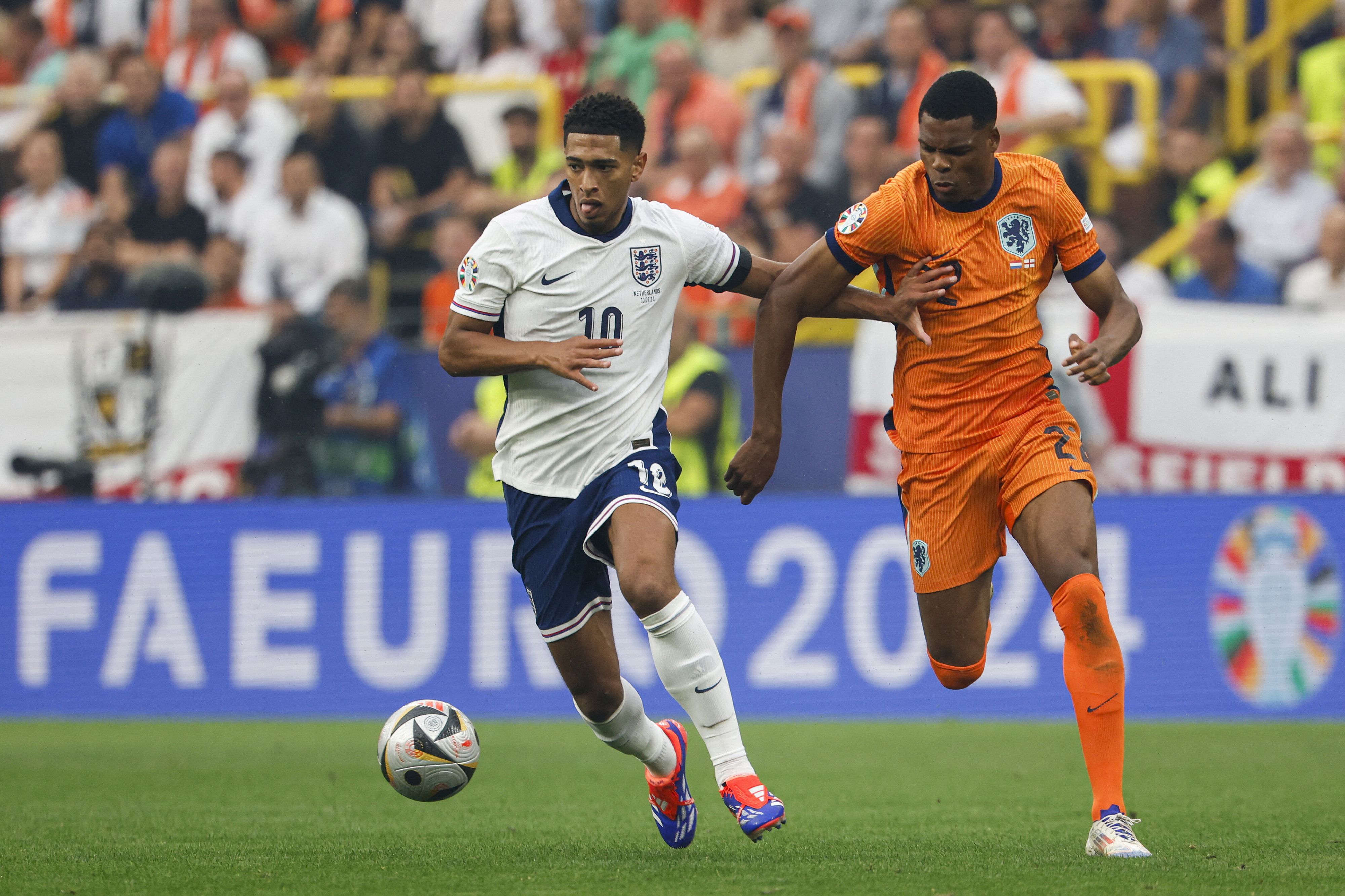 Nei primi minuti le squadre si alternano in un possesso palla ragionato, ma al primo vero tentativo d'affondo l'Olanda passa: Simons strappa palla a un ingenuo Rice, punta verso l'area inglese e prima di entrarvi fa partire un destro fulminante che si infila all'incrocio dei pali. Un gol pazzesco che vale l'1-0. La reazione dell'Inghilterra è immediata e quasi rabbiosa. Kane prima spaventa Verbruggen da lontano, poi si lamenta per un duro contrasto con Dumfries in piena area. Zwayer fa segno di proseguire, ma il Var lo richiama al monitor e lo convince ad assegnare il penalty, che lo stesso Kane trasforma angolando in maniera perfetta. Al 23' la squadra di Southgate va letteralmente a millimetri dal raddoppio immediato, quando Foden trova il corridoio giusto per la porta dopo una serpentina, ma non riesce a dar forza al tiro e permette a Dumfries di allontanare sulla riga di porta. L'esterno dell'Inter è protagonista anche alla mezzora, quando stacca bene sugli sviluppi di corner, ma centra in pieno la parte alta della traversa. Gli risponde dopo una manciata di minuti Foden, con un sinistro da lustrarsi gli occhi che però bacia l'esterno del palo e si spegne sul fondo. Al 35' Koeman perde per infortunio Depay, ma sorprende tutti inserendo Veerman per rinfoltire un centrocampo in balia del palleggio inglese. La musica però non cambia e l'ultima occasione del primo tempo è ancora di Foden, un altro sinistro insidioso che trova pronto Verbruggen.