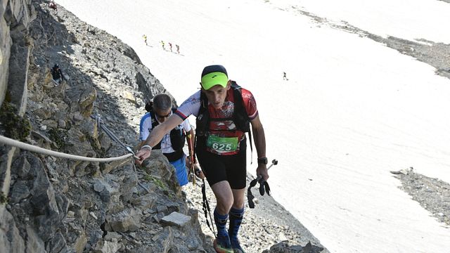 Dopo l’ennesimo cambio di rotta e un passaggio attrezzato che aiuta a superare un piccolo nevaio abbarbicato in un punto leggermente esposto, ecco laggiù (ah no, lassù) all’orizzonte, già ben individuabile, lo snodo-chiave del Colle di Bassa Serra (bassa si fa per dire, siamo a 2740 metri di quota), "difeso" dai ruderi di una postazione risalente alla Prima Guerra Mondiale. Se ne raggiunge la base attraversando un altopiano pietroso con diversi guadi e campi di neve. Attacchiamo a questo punto a testa bassa un nevaio piuttosto ripido. Per nostra fortuna nella sua parte finale (che si impenna ulteriormente) gli organizzatori hanno tagliato una serie di gradini che ci facilitano il compito. Il passaggio mi ricorda da un lato certi passaggi d’alta quota di Livigno Skymarathon, dall’altro la scalinata di ghiaccio che - almeno quando l’ho risalita io - porta al Passo Telenek e al Monte Sellero nella Skymarathon Sentiero 4 Luglio. Ed ecco qui un'altra testimonianza del carattere sky di questa prova. Superato il nevaio, un bel traverso tagliato nella roccia viva (e affrontato tenendo ben salda nella destra la catena) porta al valico e alla casermetta di cui sopra.