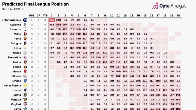 Dopo aver simulato la stagione 2024-25 10.000 volte, Opta è stata in grado di fare la media dei punti totali di ogni club in quelle simulazioni e quindi ordinare le squadre in base alla posizione. Ecco i risultati del supercomputer Opta da quelle simulazioni:
