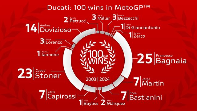 Nell’arco di quattro anni, Ducati si è imposta come il riferimento nel mondo delle Corse ed è riuscita a dimostrare questa superiorità tecnica conquistando altri 50 successi e tornando contemporaneamente a vincere il Titolo Mondiale Piloti dopo 15 anni. Francesco Bagnaia, due volte Campione del Mondo con Ducati nel 2022 e nel 2023, è attualmente il pilota più vincente con la Desmosedici GP, avendo firmato ben 25 dei 100 successi finora ottenuti dalla Rossa nella classe regina. Per il vincitore odierno Enea Bastianini quella ottenuta a Misano è stata la settima vittoria in MotoGP in sella a Ducati. Nel 2021, Jack Miller (3) ottenne il primo successo con la Desmosedici GP in Spagna, alla quale seguirono altre due vittorie. Nello stesso anno è arrivata anche la prima vittoria per un pilota di un team satellite Ducati, quella di Jorge Martín con la Desmosedici GP del team Pramac Racing. L’attuale leader del Mondiale e vicecampione del Mondo lo scorso anno, conta attualmente 7 successi con Ducati. Marco Bezzecchi, pilota del VR46 Racing Team ha invece ottenuto 3 vittorie con la Desmosedici GP, mentre uno è il successo che porta il nome del suo compagno di squadra Fabio Di Giannantonio. Anche Johann Zarco ha contributo con una vittoria nel 2023 in Australia, mentre Marc Márquez (Gresini Racing MotoGP) conta due successi, tra cui il più recente quello ottenuto a Misano due settimane fa nel GP di San Marino e della Riviera di Rimini.