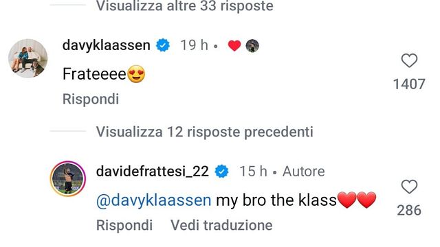 "Top player" ha scritto lo stesso Zhang sotto una foto pubblicata dal centrocampista dalle origini romane che ha a sua volta risposto in inglese. "Mi manchi presidente" l'uscita di Frattesi con tanto di cuori a sottolineare l'affetto che ancora unisce i due.