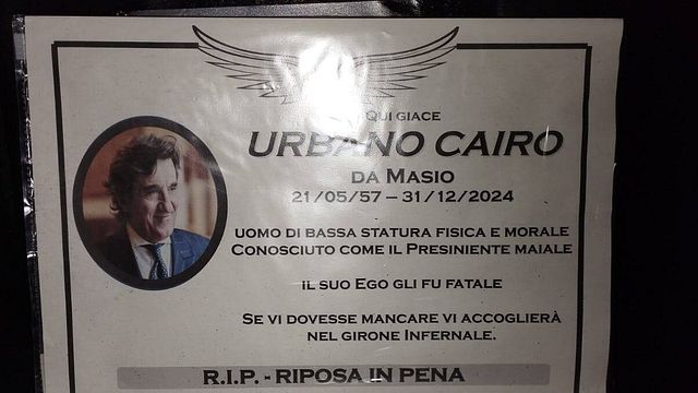 Non si placa la contestazione dei tifosi del Torino nei confronti del patron Urbano Cairo. Messaggi inquietanti e vergognosi contro il presidente granata sono comparsi fuori dal centro sportivo granata dopo la sconfitta di Roma. Come pubblicato in alcune immagini sulla pagina Facebook 'Comunicazioni Resistenti Granata 1906', all'esterno del quartier generale della squadra al Filadelfia è stata esposta una bara con una targa: "Qui giace Urbano Cairo, 21/05/57-31/12/2024. Uomo di bassa statura fisica e morale, conosciuto come il presidente maiale. Il suo ego gli fu fatale. Se vi dovesse mancare vi accoglierà nel girone infernale. R.I.P. - Riposa in pena". Sul vergognoso episodio indaga la Digos.