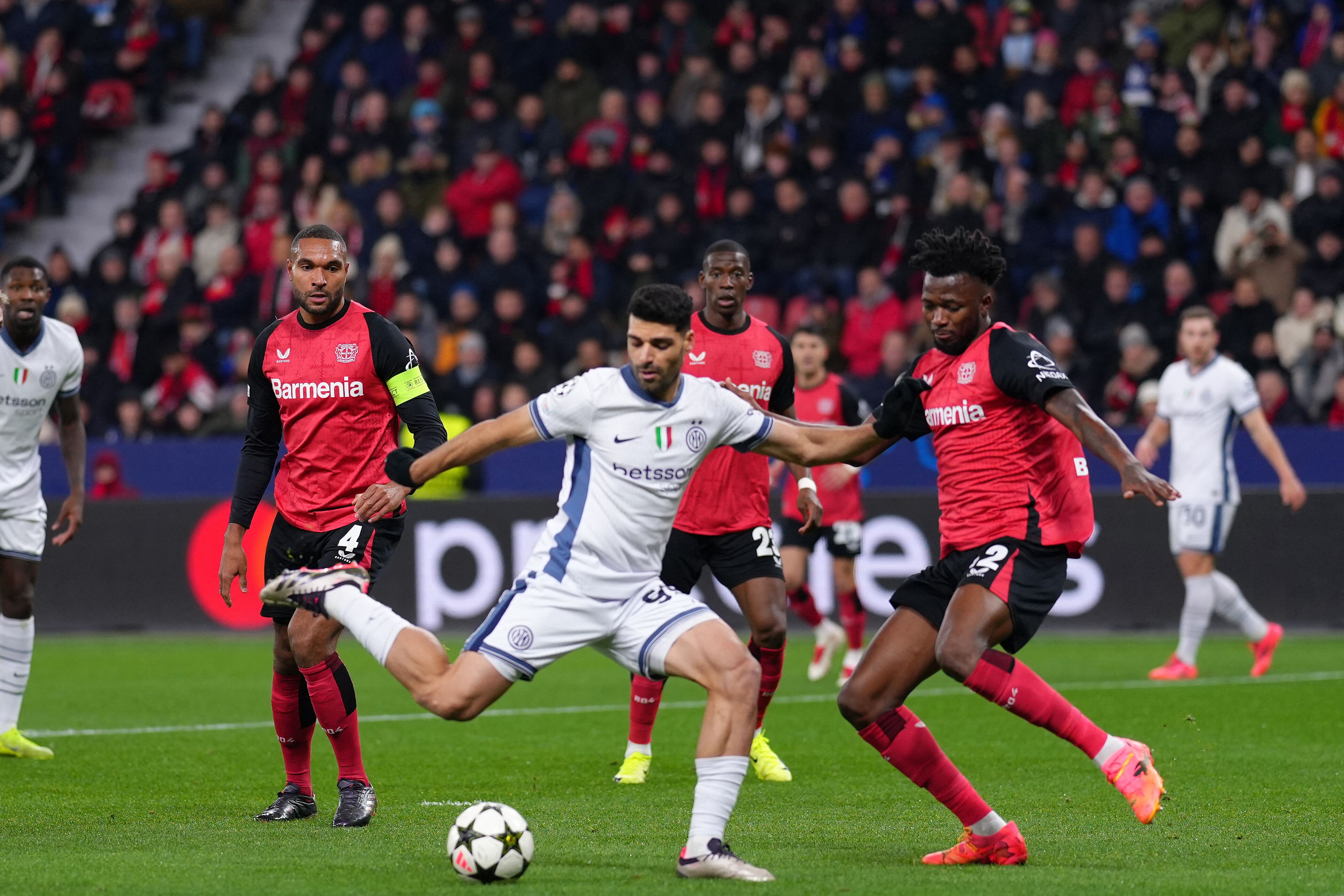 Simone Inzaghi opera cinque cambi rispetto alla formazione di partenza vista contro il Parma. Lautaro parte dalla panchina: in avanti tocca a Taremi con Thuram. Darmian e Carlos Augusto rilevano Dumfries e Dimarco sulle fasce, mentre Frattesi e Zielinski agiranno a centrocampo ai fianchi di Calhanoglu. Xabi Alonso schiera il suo Bayer a specchio: 3-5-2, con Frimpong e Hincapié sugli esterni e Wirtz in appoggio a Tella. Schick è recuperato ma solo per la panchina. Nei primi minuti i tedeschi prendono il comando del gioco, costringendo i nerazzurri a difendersi molto bassi davanti a Sommer. Il portiere svizzero corre un grosso pericolo al 3', quando Frimpong scodella in area per Tella, destro al volo centrale che si stampa contro la traversa. I padroni di casa pressano bene e fanno girare bene il pallone, anche se poi faticano ad andare alla conclusione. Taremi e Thuram faticano a tenere su la squadra e i ragazzi di Inzaghi provano a rendersi pericolosi con gli inserimenti dei centrocampisti e dei difensori. Al 26' Palacios va vicino al gol, ma il suo tiro dal limite è deviato leggermente da Bastoni sopra la traversa. Poi Calha vede l'inserimento coi tempi giusti di Frattesi, ma l'ex Sassuolo di testa non trova lo specchio. Bisseck recupera bene su Wirtz dopo un errato posizionamento e il fuoriclasse tedesco scalda i guantoni di Sommer al 35' con un destro che l'estremo difensore respinge in tuffo.