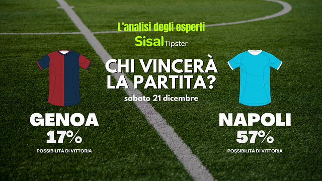 Dopo la convincente vittoria in rimonta in casa dell’Udinese, per il Napoli è tempo di tornare nuovamente in campo: l’obiettivo è quello di non far scappare l’Atalanta, avanti di due punti in classifica. In occasione della 17° giornata di Serie A, la squadra di Antonio Conte farà visita al Genoa, gara in programma sabato 21 dicembre alle ore 18. La squadra ligure è ancora imbattuta sotto la gestione di Patrick Vieira ed è reduce dallo 0-0 di San Siro contro il Milan. I rossoblù, però, sono il peggior attacco del campionato e dovranno fronteggiare la migliore difesa della Serie A, quella del Napoli che ha subito solamente 11 gol fin qui ma orfana dell’infortunato Buongiorno. Proprio per questo motivo, secondo gli esperti SisalTipster, le possibilità che il Genoa non trovi la rete sono del 45%.