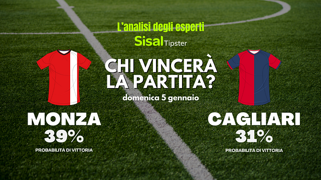 Secondo gli esperti SisalTipster, la sfida tra Monza e Cagliari sarà estremamente equilibrata sul campo, così come nelle percentuali di vittoria. Infatti, a essere leggermente favoriti sono i padroni di casa, il cui successo è offerto al 39%. Leggermente più basse le probabilità da parte della squadra di Davide Nicola, il cui blitz in terra brianzola è dato al 31% mentre si scende al 30% per una divisione della posta che, all’atto pratico, potrebbe non servire a nessuna delle due. Vista l’importanza della sfida, e il momento non troppo brillante di Monza e Cagliari, gli esperti si attendono una gara che potrebbe essere decisa da una conclusione da fuori area: entrambe le formazioni dispongono di calciatori molto abili sotto questo punto di vista, ecco perché le probabilità che ciò accada sono del 36%.