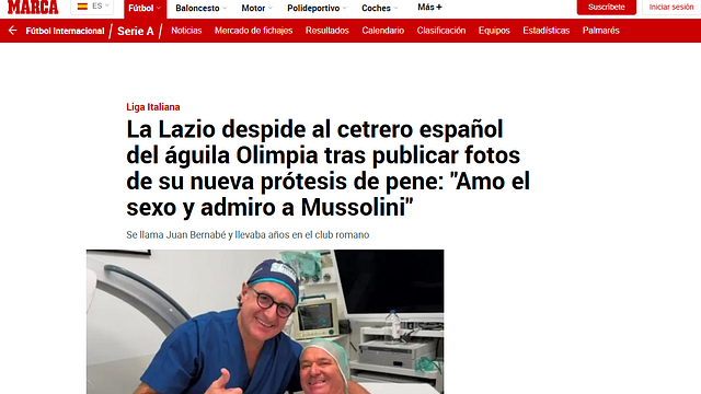 Dalla Spagna - suo Paese d'origine - all'Inghilterra passando per mezza Europa: ha oltrepassato i confini italiani la notizia dei video 'intimi' dell'ormai ex falconiere della Lazio, Juan Bernabè, licenziato in tronco ieri sera dal club biancoceleste "allibito" dal comportamento dello spagnolo. Da Marca al Guardian, dalla Bbc a Mundo deportivo, giusto per citare alcuni dei più prestigiosi media stranieri, c'è spazio per "l'iniziativa" di Bernabè che gli è costata il posto di custode del centenario simbolo della Lazio, l'aquila Olimpia. Marca ricorda che già "nel 2021, la Lazio licenziò Juan Bernabé, per aver fatto il saluto fascista davanti agli spalti. Non tardò ad ammettere di essere un ammiratore di Mussolini. Qualche tempo dopo, lo assunse di nuovo. Ora, nel 2025, viene nuovamente cacciato dopo una tremenda polemica generata dalla pubblicazione sui suoi social network di foto e video del nuovo pene protesico che si è fatto impiantare 'da diverse angolazioni'". Il tabloid spagnolo, che mette anche la foto del falconiere sorridente in clinica con il chirurgo post operazione, parla di "situazione surreale". Nelle interviste rilasciate dopo l'operazione, Bernabè ha dichiarato di non aver mai avuto problemi sessuali, ma ora potrà decidere "quanto durerà il rapporto con la sua compagna". "Ho la coscienza a posto - le parole di Bernabè ieri a La Zanzara - l'ho pubblicato solo per informare le persone sull'intervento. Per me la nudità è normale perché sono cresciuto in una famiglia naturista e con la mente aperta, non capisco quale sia il rapporto della mia foto con la pornografia". Figura controversa, Bernabè non ha mai nascosto di essere di destra e di ammirare Benito Mussolini.