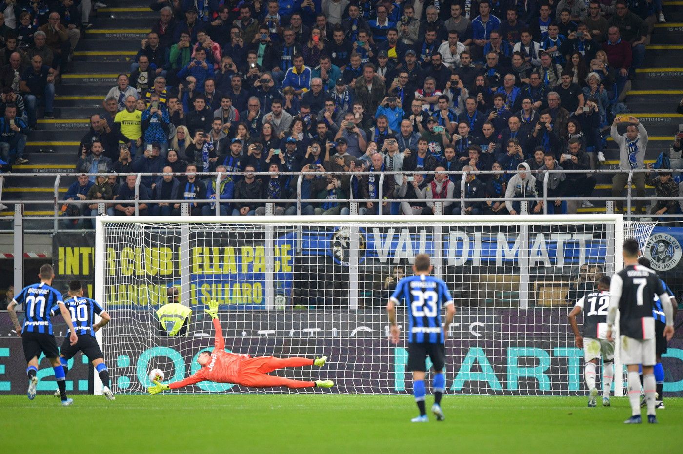 Doppio colpo Juve nel Derby d'Italia. A San Siro la squadra di Sarri batte l'Inter 2-1 e vola in vetta (+1), scavalcando i nerazzurri e interrompendo il percorso netto di Conte. Nel primo tempo Dybala sblocca la gara al 4', poi CR7 centra una traversa, Martinez pareggia su rigore (fallo di mano in area di De Ligt) e Rocchi annulla una rete a Ronaldo. Nella ripresa poi il palo ferma un tiro di Vecino e Higuain firma il gol partita all'80'.