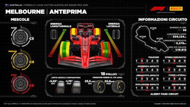 La settantacinquesima edizione del Campionato del Mondo FIA di Formula 1 partirà dall’Australia, precisamente dall’Albert Park di Melbourne, capitale dello Stato di Victoria, dove è stato allestito un circuito cittadino semipermanente. L’appuntamento australiano sarà il primo di un percorso lungo 24 tappe – primato di gare in un anno eguagliato – che porterà la Formula 1 in cinque continenti dal prossimo fine settimana fino a quello del 5-7 dicembre. Le mescole Dopo l’“ammorbidimento” dello scorso anno, Pirelli ha confermato per la prima gara del 2025 la terna composta da C3 come Hard, C4 come Medium e C5 come Soft. Rispetto ad un anno fa, si tratta peraltro di un’evoluzione del prodotto, sia in termini di costruzione che di caratteristiche delle mescole. La prima è stata leggermente modificata per adeguarsi ai maggiori carichi aerodinamici che saranno generati dall’ultima versione delle monoposto di questa generazione.