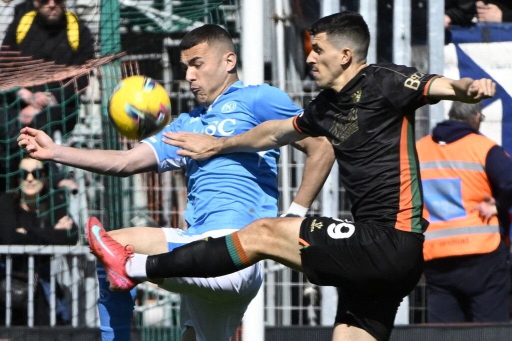 Oristanio non è al meglio dopo l'attacco influenzale e parte in panchina: nel 3-5-2 di Di Francesco, la coppia d'attacco è formata da Fila e Maric. Conte recupera Anguissa, ma conferma l'11 delle ultime uscite con Gilmour al fianco di Lobotka e la coppia Lukaku-Raspadori in avanti. Il primo tempo del Penzo è davvero bello e denso di emozioni. Già al 5' il Napoli può sbloccare il match: Candé respinge male sui piedi di Raspadori, sinistro a giro che prende il palo alla destra di Radu e attraversa tutta la porta. I padroni di casa non stanno a guardare, cambiano spesso il gioco per allargare le maglie difensive degli ospiti e al 13' Meret salva in due tempi su Fila. Passano 5' e Lukaku serve Raspadori, botta sul primo messa in angolo da Radu, grande protagonista del match. Il portiere romeno, poi, vince il doppio duello con McTominay, respingendo due colpi di testa insidiosi dell'ex Manchester United al 19' e al 30'. Di Francesco perde Maric per un problema a una caviglia: dentro Oristanio. Al 42', il Venezia ha una doppia chance per passare in vantaggio, ma Meret respinge su Perez, poi Rrahmani salva sulla linea la ribattuta di Fila. Le emozioni non sono finite qua perché Radu inchioda sulla linea di porta un colpo di testa di Lukaku e poi salva in uscita su Di Lorenzo. In entrambe le occasioni male Candé, che prima si fa sovrastare dal bomber belga e poi svirgola un rinvio favorendo l'incursione del capitano degli azzurri.